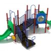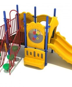 Richardson playset is a straightforward but exciting structure that is great for children of all ages. They can reach the main deck by using the ADA accessible Transfer Station stairs, or by climbing the nautically themed Sea Creature Climber, which has molded shells, starfish, a turtle, and other ocean shapes that function as hand grips. It also has a Double Slide, where children will go to slide over and over again. The double shape allows twice as many kids to ride at once, eliminating wait times. Above the main deck, there is a five-foot deck that can be reached by the stairs, or by ascending the vertical Snake Climber. This deck has the largest slide of the structure: a five foot tall Wave Slide. It also has a Gear Panel, which makes the whole structure feel like a giant machine that kids are the engineers of.
